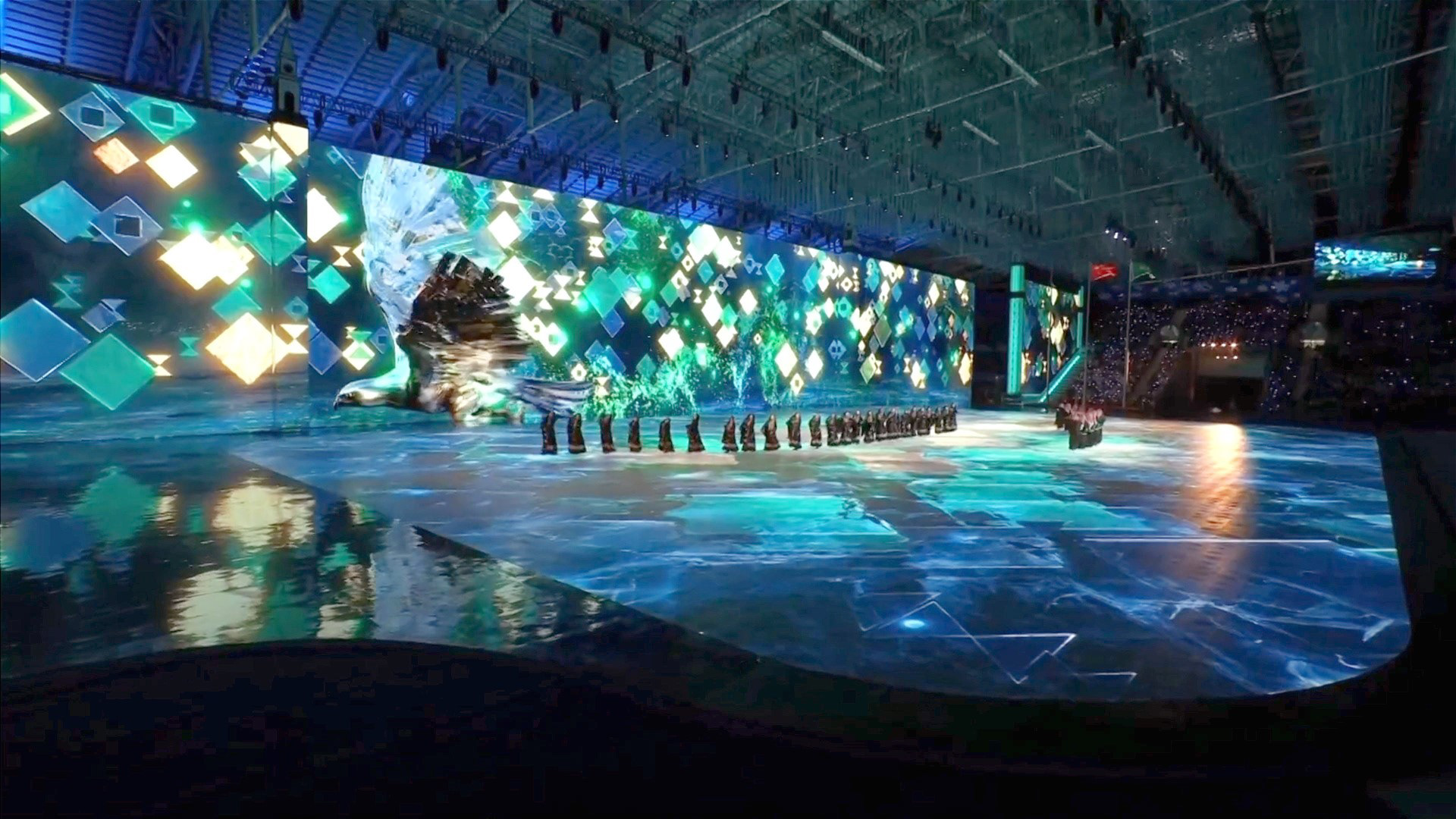 The protagonist of this act is a majestic metallic falcon, a national symbol of strength and vision, soaring through this dreamlike landscape and carrying the spirit of the Games forward.