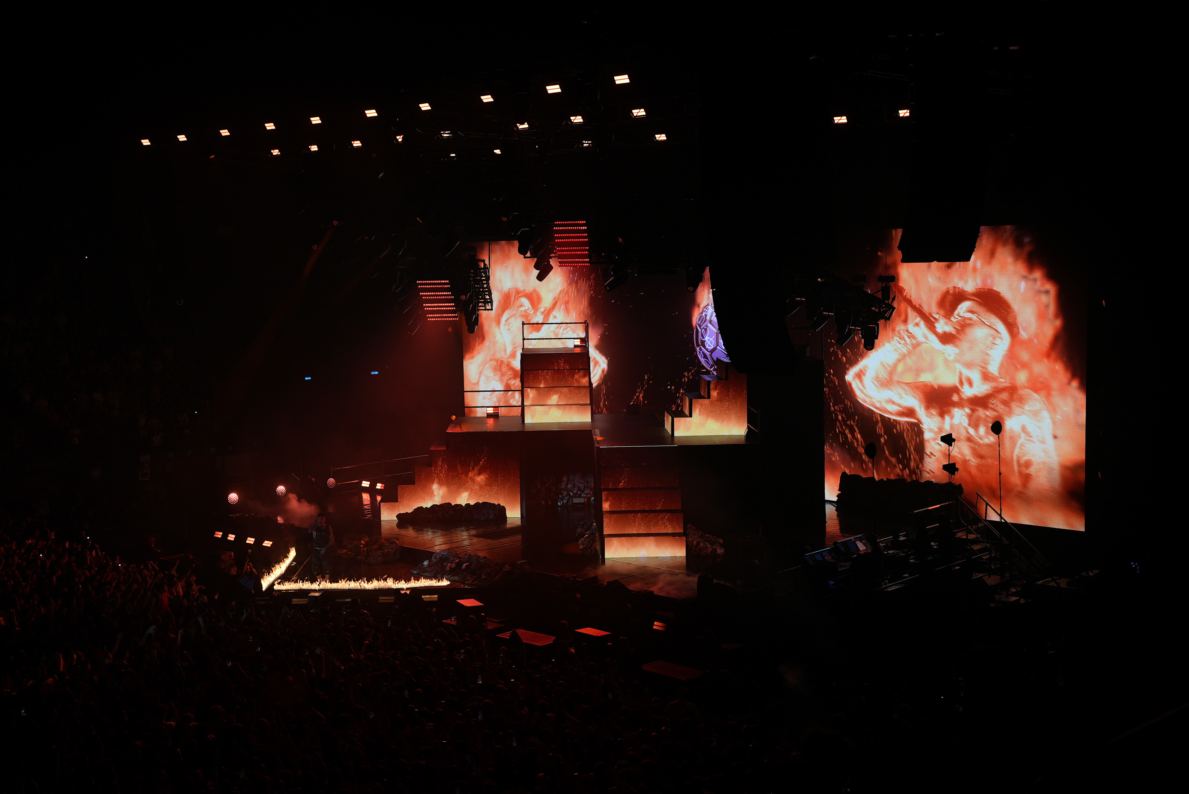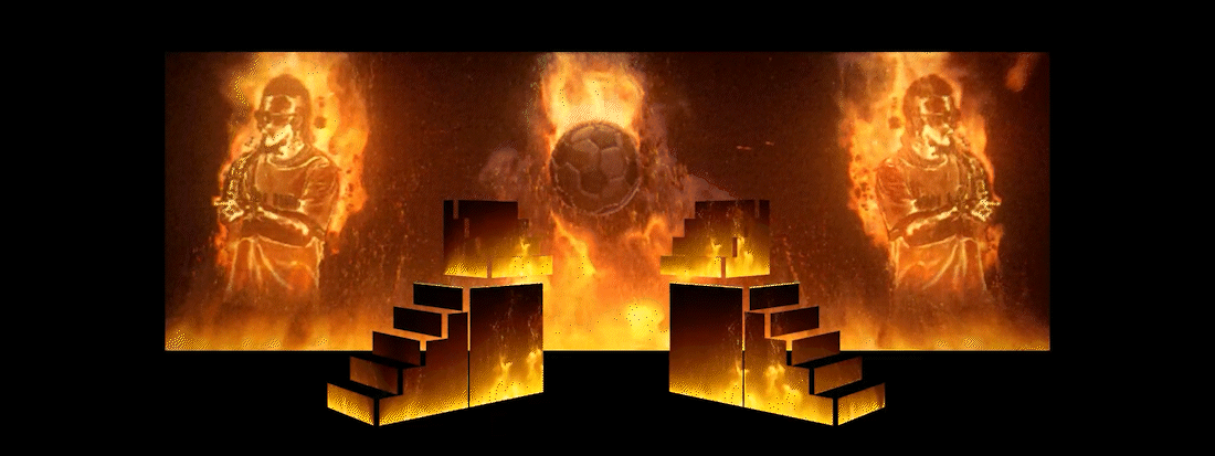Through it, we were able to design and deliver complex stage effects: glitchy animations inspired by coding aesthetics, three-dimensional flames synchronized with sound and lighting cues, and fluid graphic layering that reacted to movements on stage.