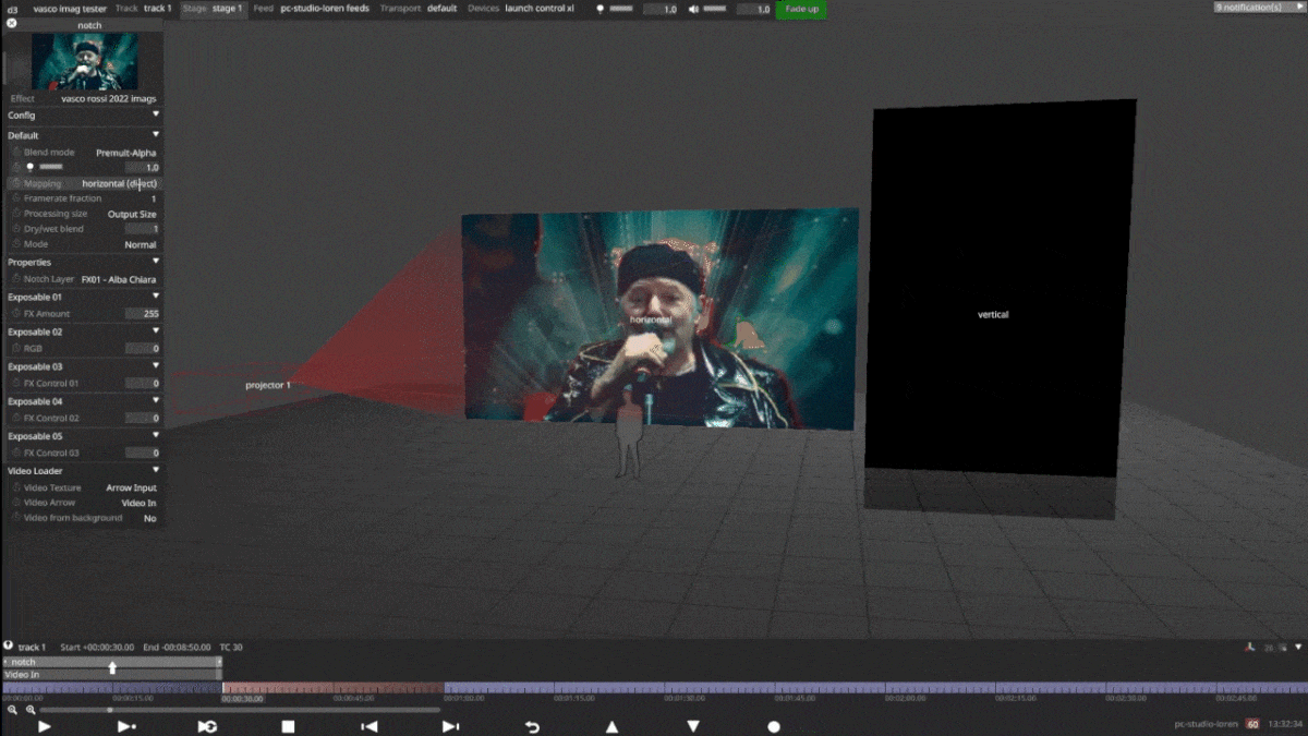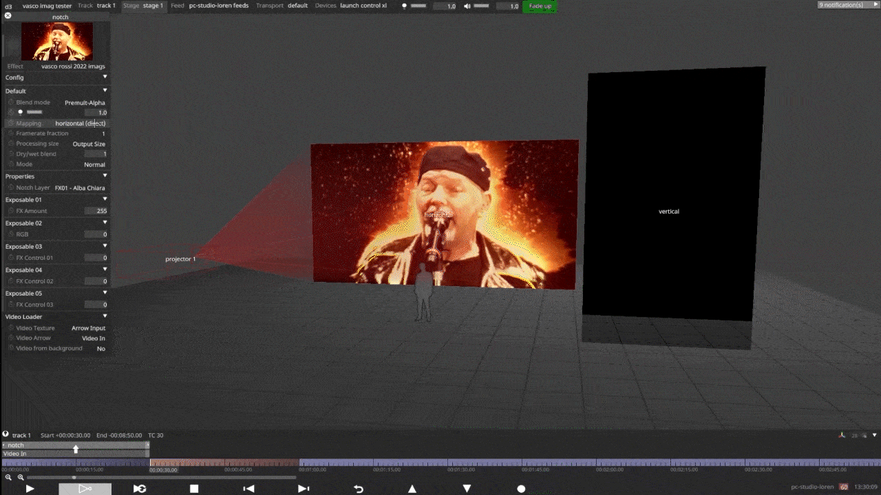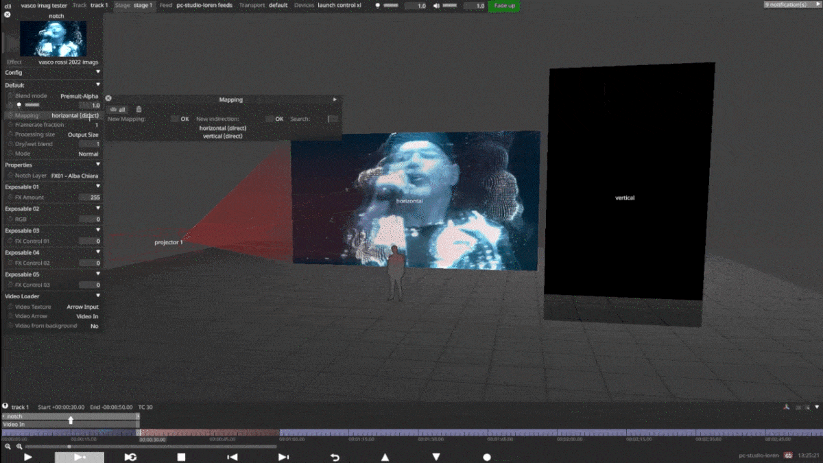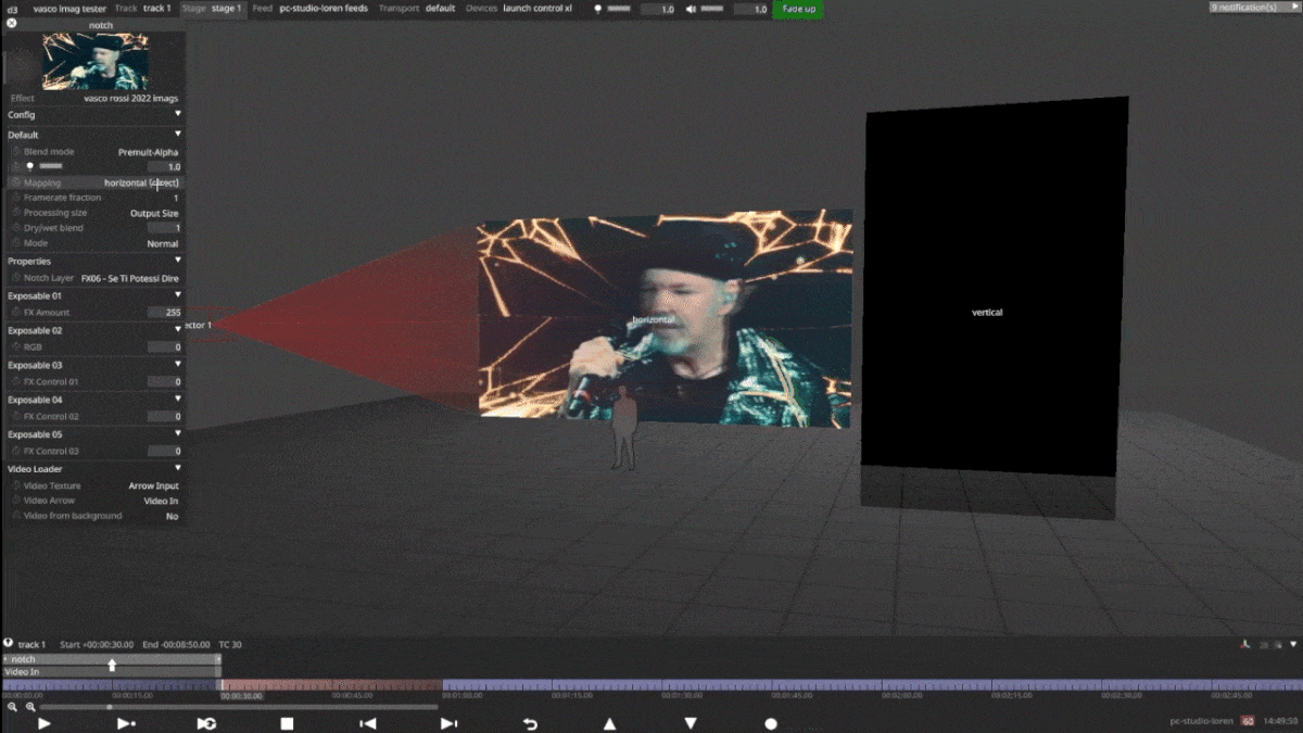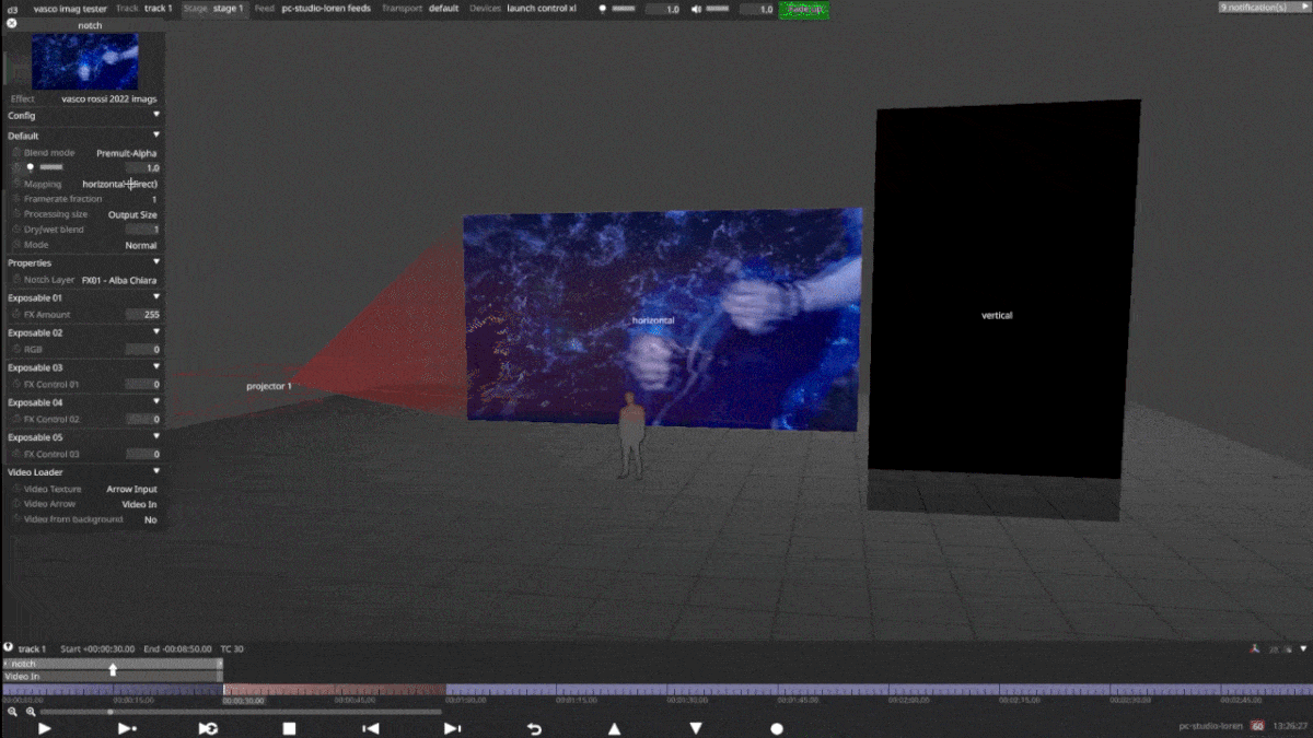 After completing the design of the Notch effects bundle, two weeks in Trento followed for the setup and preparation of the actual show. In the field, we used 5 gx2c units to manage the immense pixel map, approximately 12 thousand pixels long on the longer side. The greatest challenge was indeed to maintain high performance for the effects with such a large pixel map spread across 7 ledwalls.