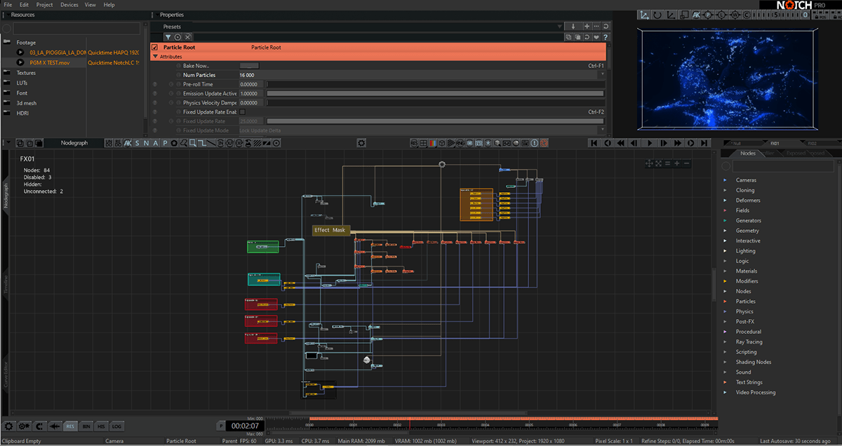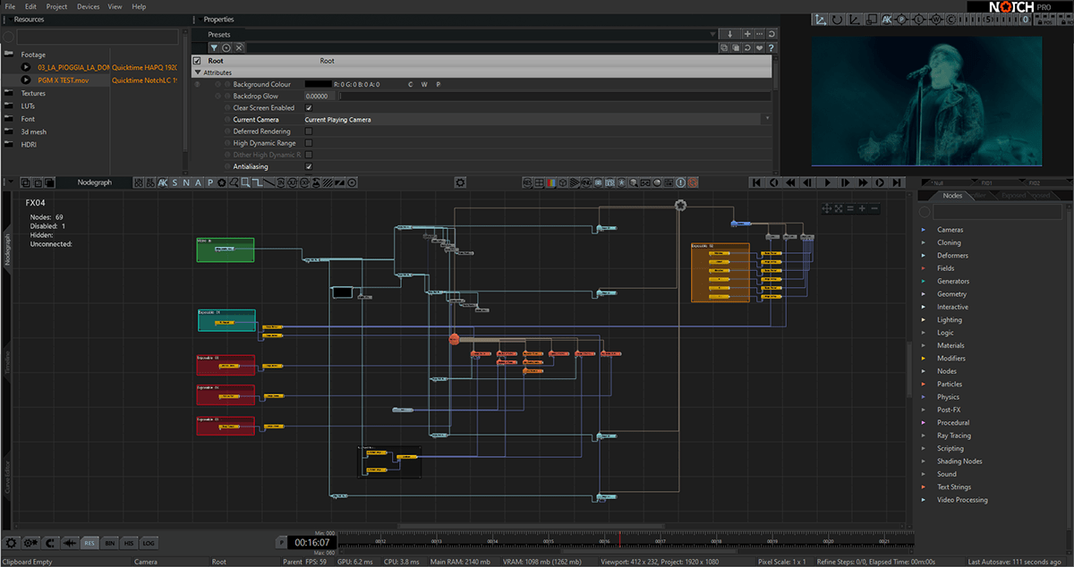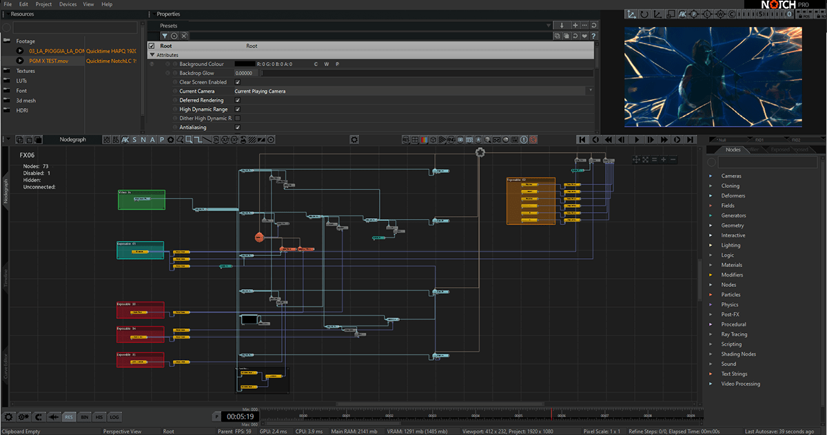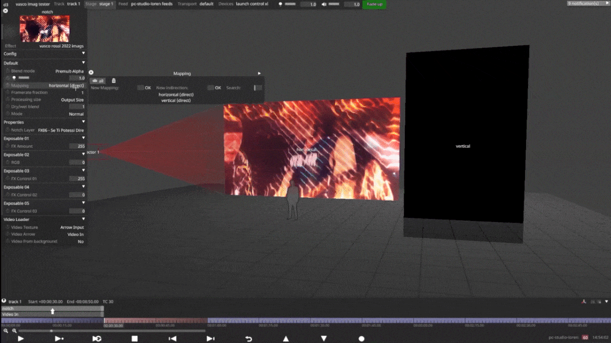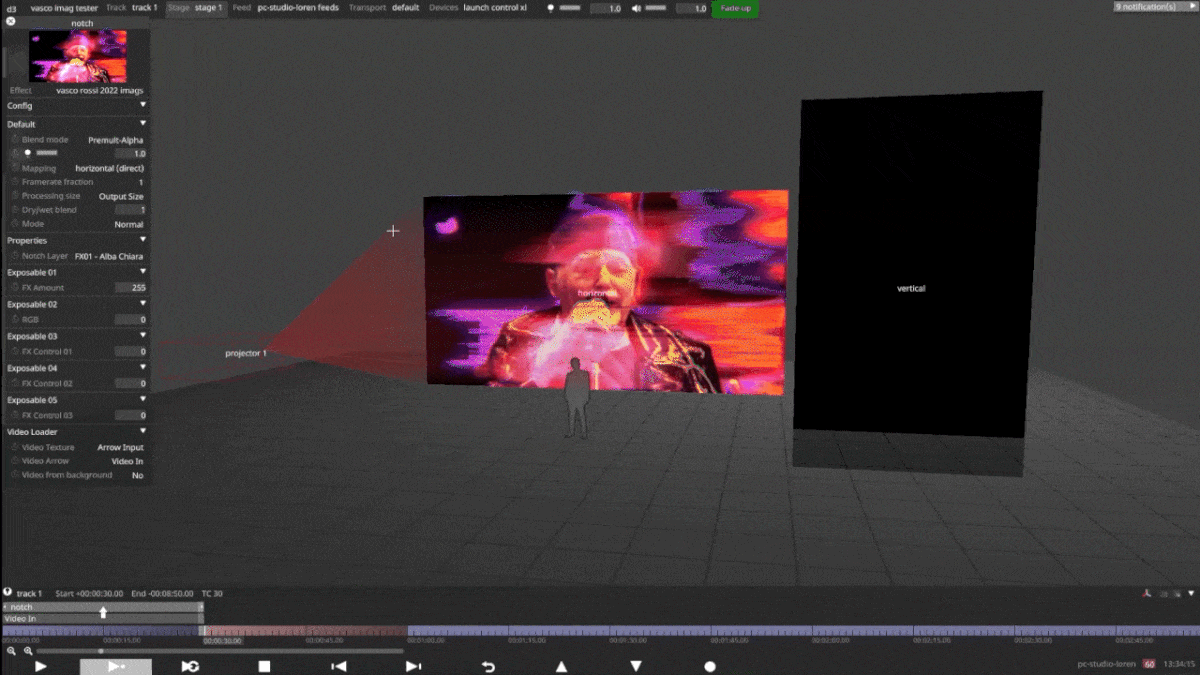 After completing the design of the Notch effects bundle, two weeks in Trento followed for the setup and preparation of the actual show. In the field, we used 5 gx2c units to manage the immense pixel map, approximately 12 thousand pixels long on the longer side. The greatest challenge was indeed to maintain high performance for the effects with such a large pixel map spread across 7 ledwalls.